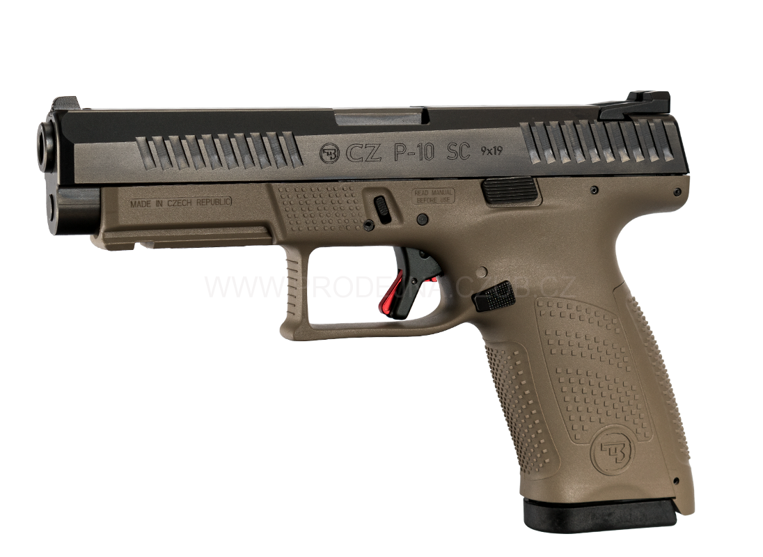 A hybrid firearm that combines the compact frame of the CZ P-10 C with the longer slide and barrel of the full-size CZ P-10 F. Finished in Flat Dark Earth (FDE), this model is designed for users who want the concealability of a compact grip but the ballistics and sight radius of a full-size pistol.